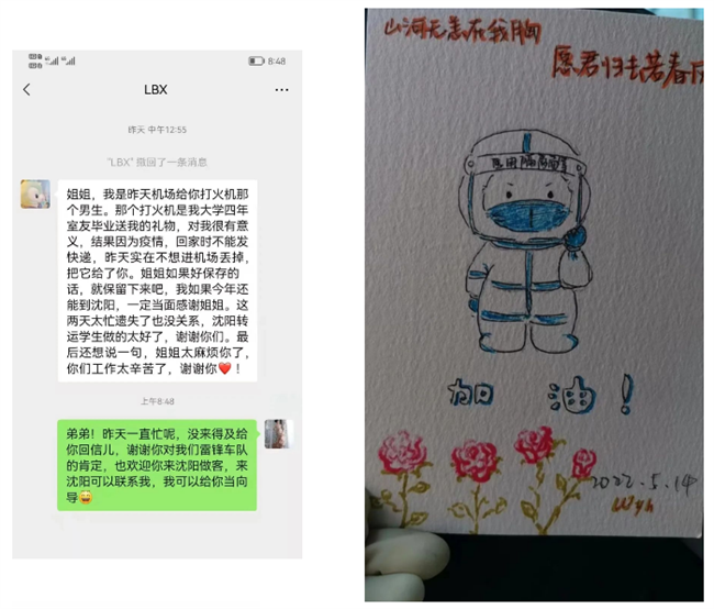 一名同學將自己的一個有紀念意義的打火機送給我們的駕駛員李巖;一名同學為了感謝駕駛員幫忙搬運行李、服務(wù)周到,臨下車前畫了一幅畫交到駕駛員王洋的手上;還有的同學親手制作卡片、贈送小禮物,從內(nèi)心深處表達著對駕駛員以及沈陽這座溫暖城市的感激之情。