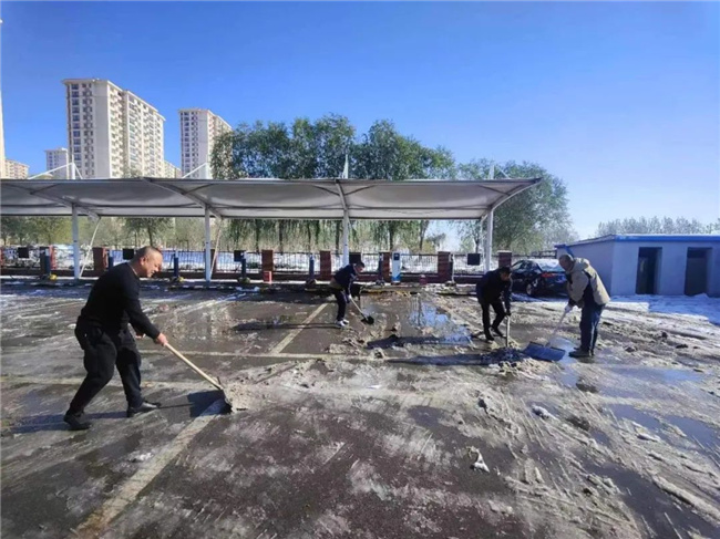 清掃公交場(chǎng)區(qū)積雪,保障車輛安全行駛。
