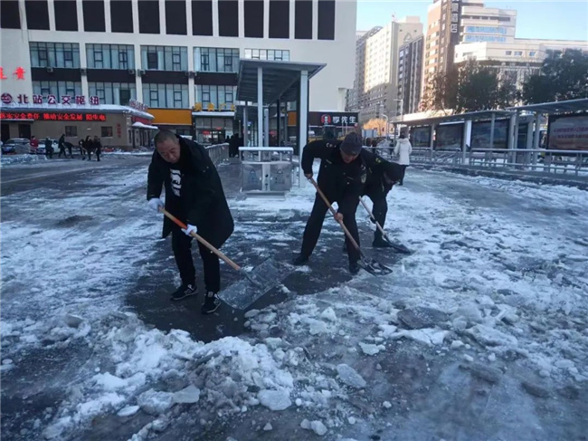 清掃公交樞紐站積雪,保障車輛安全進(jìn)出站。