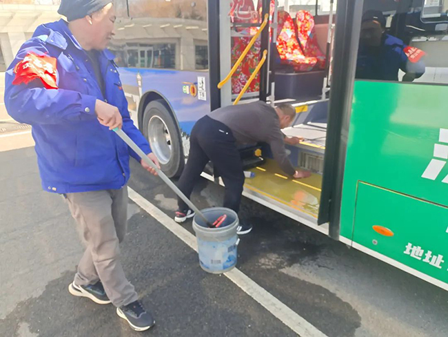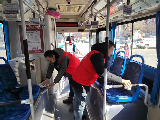活動中,駕駛員們拿著抹布、拖把等清潔工具對車廂玻璃、座椅、地面、車身等部位進行清洗、擦拭。大家耐心細致,干勁十足,經(jīng)過一個小時的努力,車輛內(nèi)外被打掃得干干凈凈。