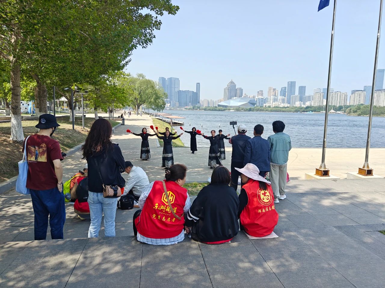 當天清晨9點,載滿歡聲笑語的公交車準時出發(fā)。在奧林匹克公園河畔,老人們漫步林蔭道,賞花觀景、拍照留念,社區(qū)老年模特隊身著馬面裙,手拿紅色折扇在湖邊翩翩起舞驚艷全場,翩躚身影與粼粼波光相映成趣。返程途中,車廂化身為"流動文化站",黨員志愿者帶領(lǐng)老人們開展紅歌聯(lián)唱,《我和我的祖國》《沒有共產(chǎn)黨就沒有新中國》的旋律此起彼伏,溫情涌動間拉近了黨群距離。
