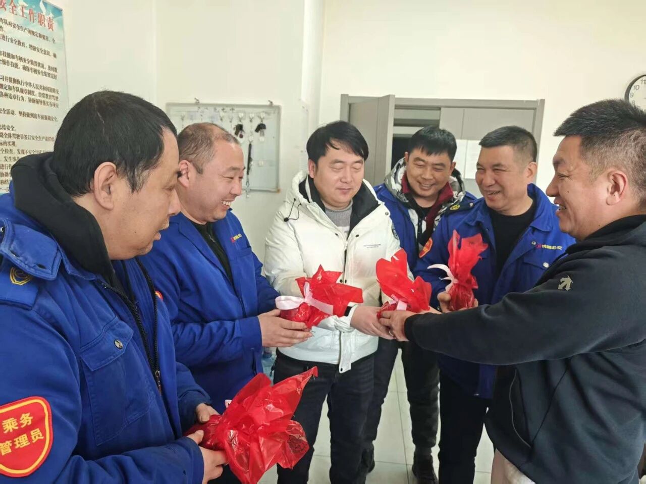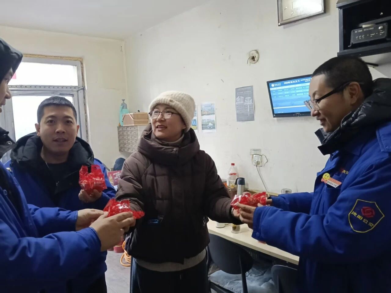 寒冷冬日,128路車隊(duì)休息室內(nèi)暖意融融。一份份精心包裝的“平安果”,被送到結(jié)束運(yùn)營(yíng)返場(chǎng)的駕駛員手中,伴隨著一句句樸實(shí)而鄭重的安全叮嚀。
